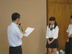1学期終業式2015年7月21日(火)本日、終業式が行われました。写真は夏休み中にオーストラリア・ケアンズへ短期留学する生徒が挨拶をしている場面です。今年から1人あたり約10万円の補助金がもらえるようになりニュージーランドへ行く生徒と合わせると総勢45人になります。 |